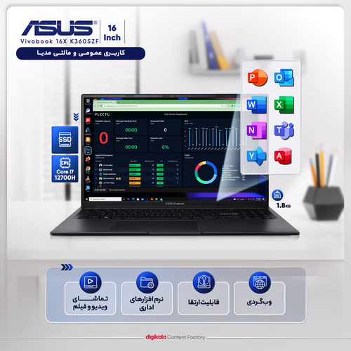 ایسوس با سری لپتاپهای Vivobook گزینههای متعددی برای ردهها کاربری مختلف در اختیار کاربران قرار میدهد. این لپتاپها از ترکیب مختلفی از قطعات استفاده میکنند و در بازههای قیمتی متفاوت در دسترس قرار دارند. لپتاپ Vivobook 16X K3605ZF یکی از گزینههای مناسب برای کاربری روزمره و عمومی و استفاده در محیط کار یا تحصیل به شمار میآید که از توان پردازشی بالایی برخوردار است. این لپتاپ 16 اینچی حدود 1.8 کیلوگرم وزن دارد و به راحتی قابل حمل و جابجایی خواهد بود. صفحهنمایش رزولوشن 1920 در 1200 یا WUXGA دارد و تا 300 نیت روشنایی تولید میکند که برای استفاده در محیط پرنور قابل قبول است. نرخ بهروزرسانی 120 هرتزی تجربه کاربری روانی به همراه دارد و در این رده از نقاط قوت محسوب میشود. این نمایشگر دقت رنگ عالی و نسبت تصویر 16:10 داشته و به این ترتیب برای طراحی، ادیت و تولید محتوا بسیار مناسب خواهد بود. پردازنده مرکزی Core i7 مدل 12700H با کاربرد این لپ تاپ تناسب کامل داشته و از پس وظایف خود برمیآید. رم در این مدل از حافظه DDR4 با فرکانس 3200 مگاهرتز تشکیل شده و از توانایی لازم برای اجرای چندین برنامه به صورت همزمان برخوردار است. پردازشهای گرافیکی بر عهده GeForce RTX 2050 است که به 4 گیگابایت حافظه اختصاصی مجهز شده تا این لپتاپ برای پردازشهای گرافیکی سنگین و همچنین اجرای بازیهای جدید با کیفیت مناسب آماده باشد. پردازنده نسل 12 با 14 هسته پردازشی در کنار پردازنده گرافیکی قدرتمند، صفحه نمایش دقیق و با کیفیت و باتری 3 سلولی با ظرفیت 50 وات ساعت از ویژگیهای مهم این مدل هستند.